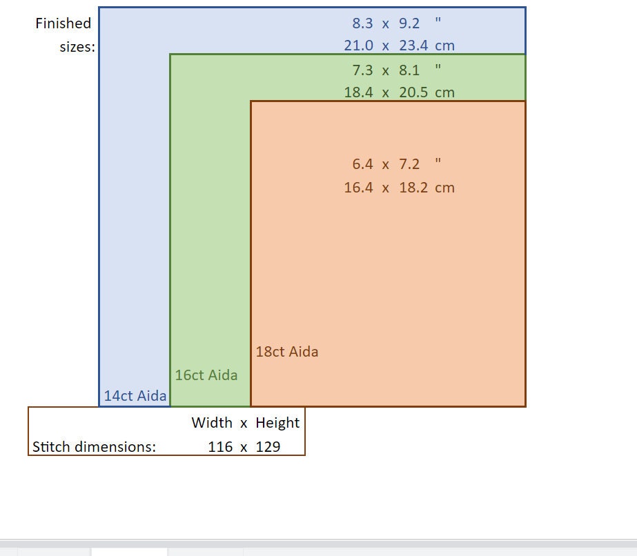 Colors 3 DMC color references provided, as well as usage estimates in stitches and skeins for all colors.