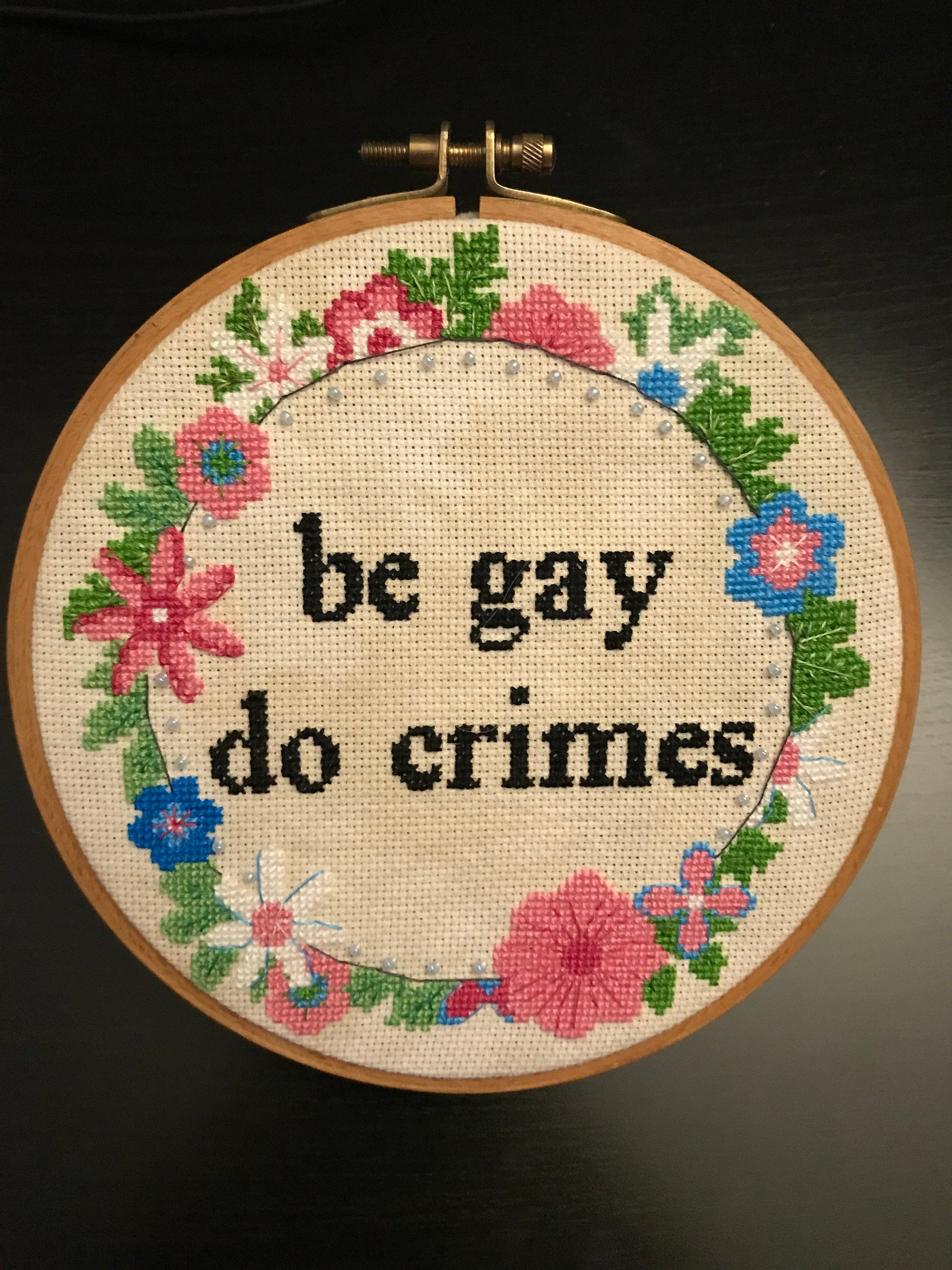 This pattern couples queer anarchist rallying cries with grandma-made-this charm. It's designed to fit in a 7" embroidery hoop when stitched on 18ct aida. It also features the colors of the Transgender Pride flag in the flowers.