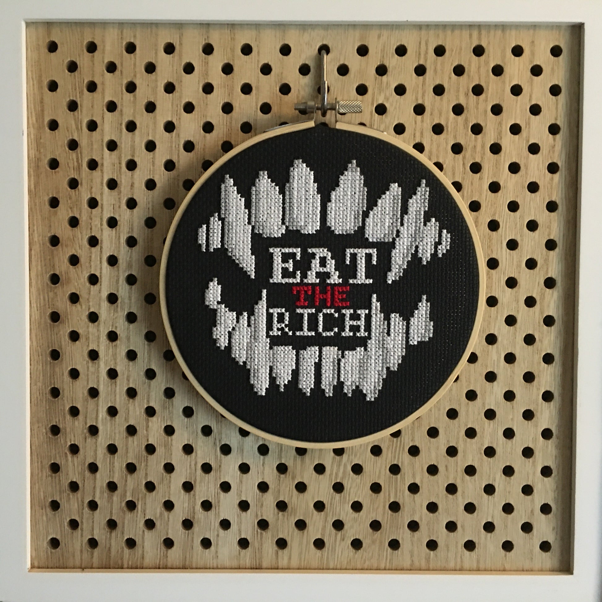 Get your stitch on with our hilarious 'Eat the Rich' cross stitch pattern! Featuring vampire teeth and a cheeky message, this pattern is sure to add some bite to your crafting. Perfect for anyone with a sense of humor and a hunger for social justice. Add it to your collection today!