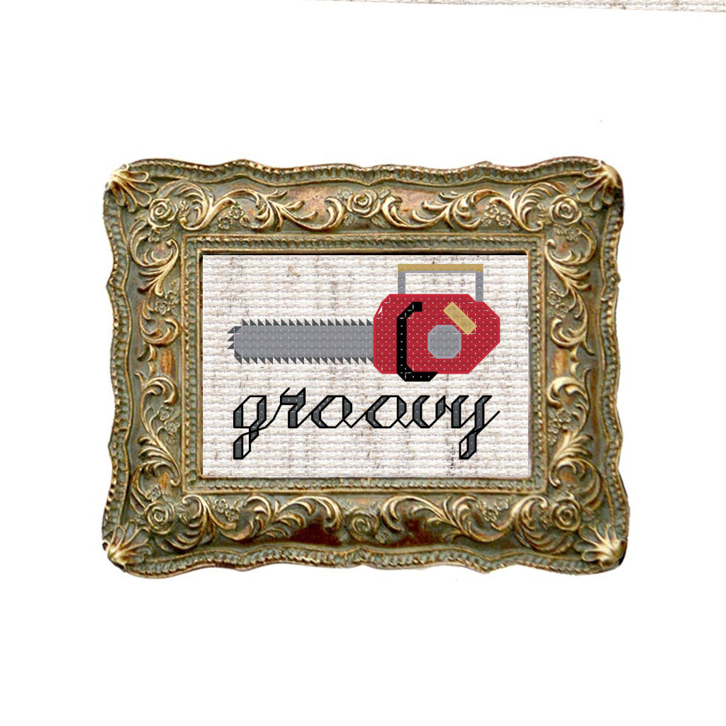 Introducing our newest cross stitch pattern, inspired by the iconic cult classic movies Army of Darkness and Evil Dead! This pattern is sure to please any fan of the series, featuring a chainsaw and the word "groovy" in cursive lettering as smooth as Ash's way with the ladies (dead or otherwise).