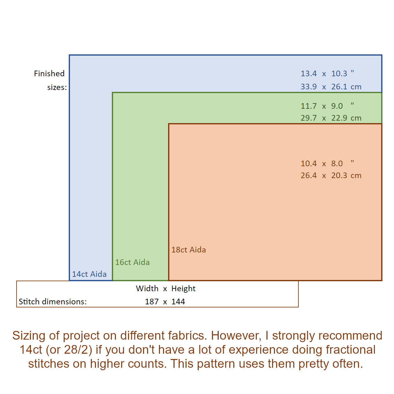 Overall Size: 187x144 stitches (see images for sizing on different fabric counts)
