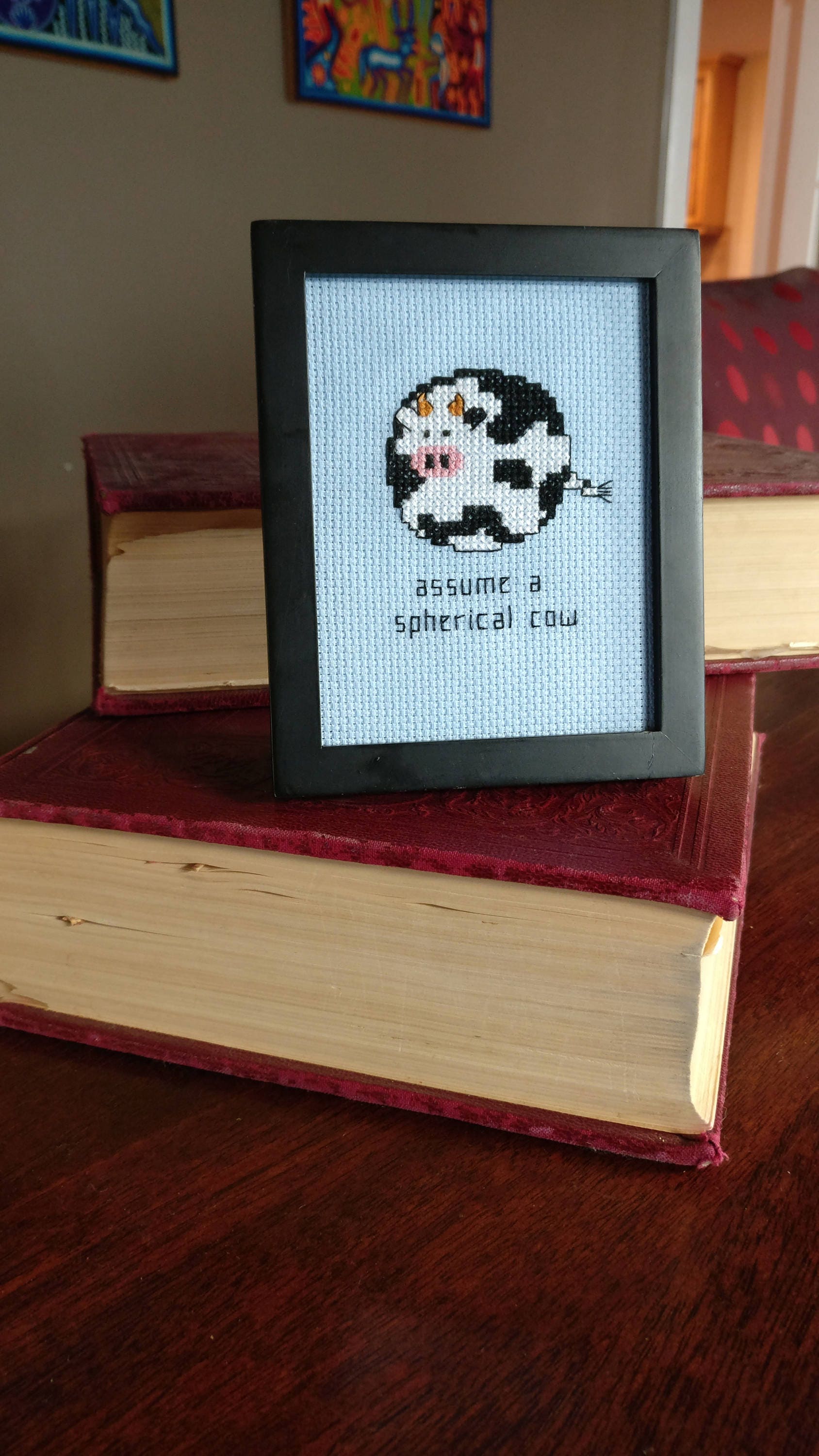 If you've ever taken an advanced science class, you've probably heard the joke about the farmer with the unproductive cows, which ends with the punchline seen here. The joke is also a cautionary tale about simplifying a problem to the point where any solutions you reach are inapplicable to the real world. Any scientist would love to have this stitch on their desk, but it could serve as a healthy reminder to any of us that things are not always as simple in reality as they seem on paper.