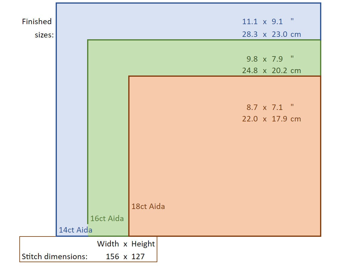The sample is shown approximately to scale in an 8x10 frame on 18ct oatmeal aida. Sample image is a digital render so slight color variations may exist between the sample photo and the actual threads. I selected the colors based on physical samples so the finished product will look good, just maybe a bit different.
