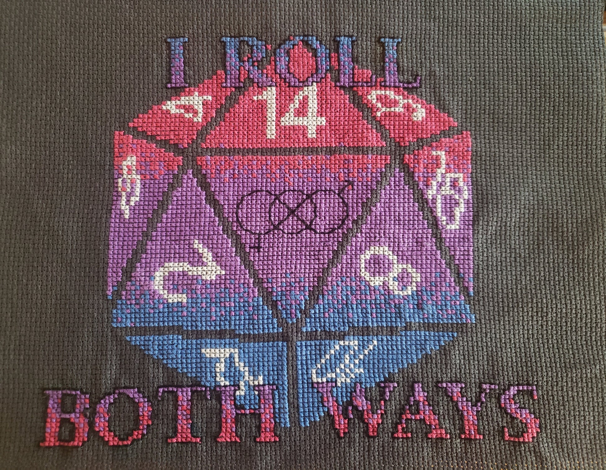 This pattern features a D20 festooned with the colors of the Bi Pride flag. There is also a popular symbol denoting bisexuality in the place of the 20. There's a joke in here about Critical Hit but it escapes me right now.