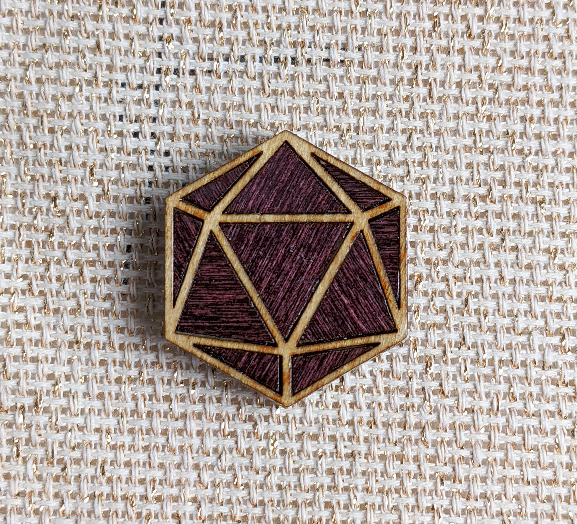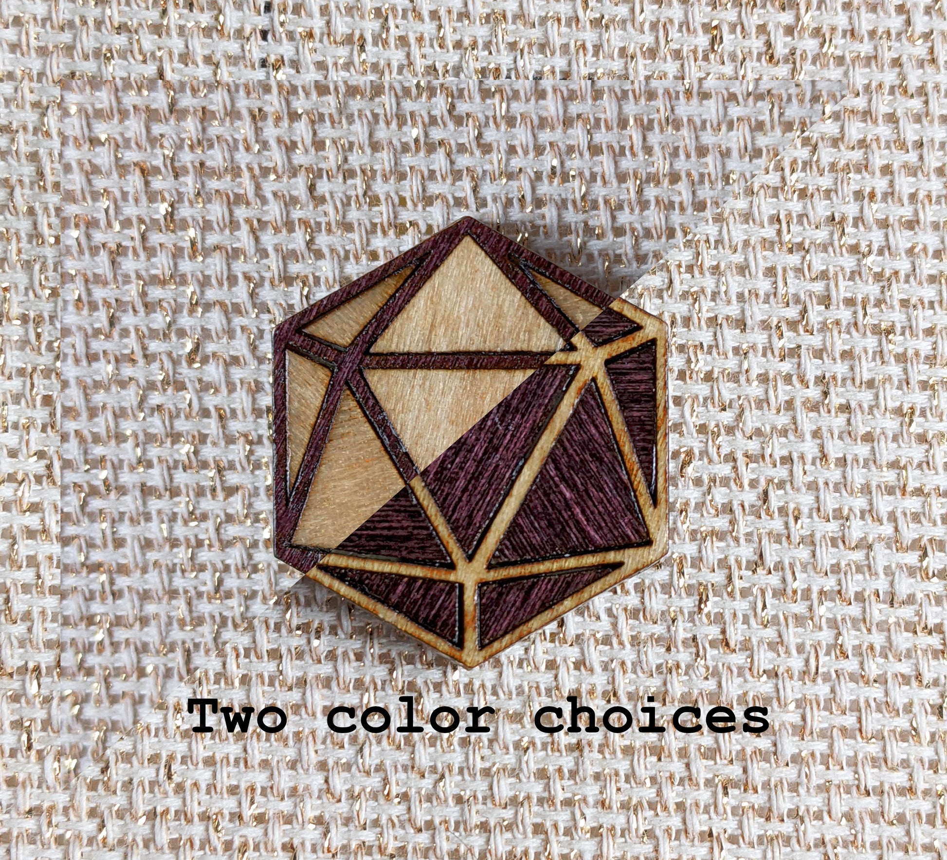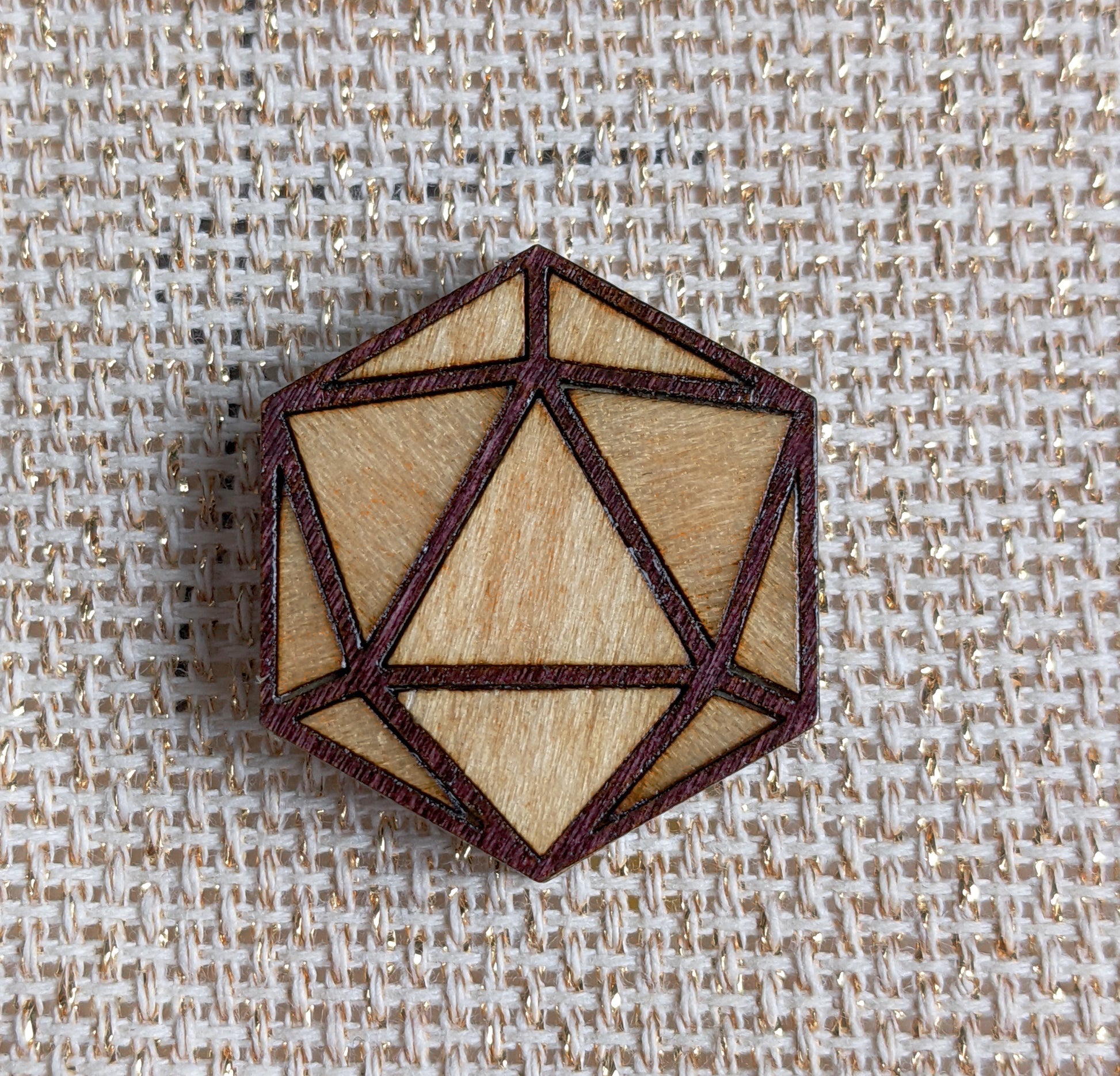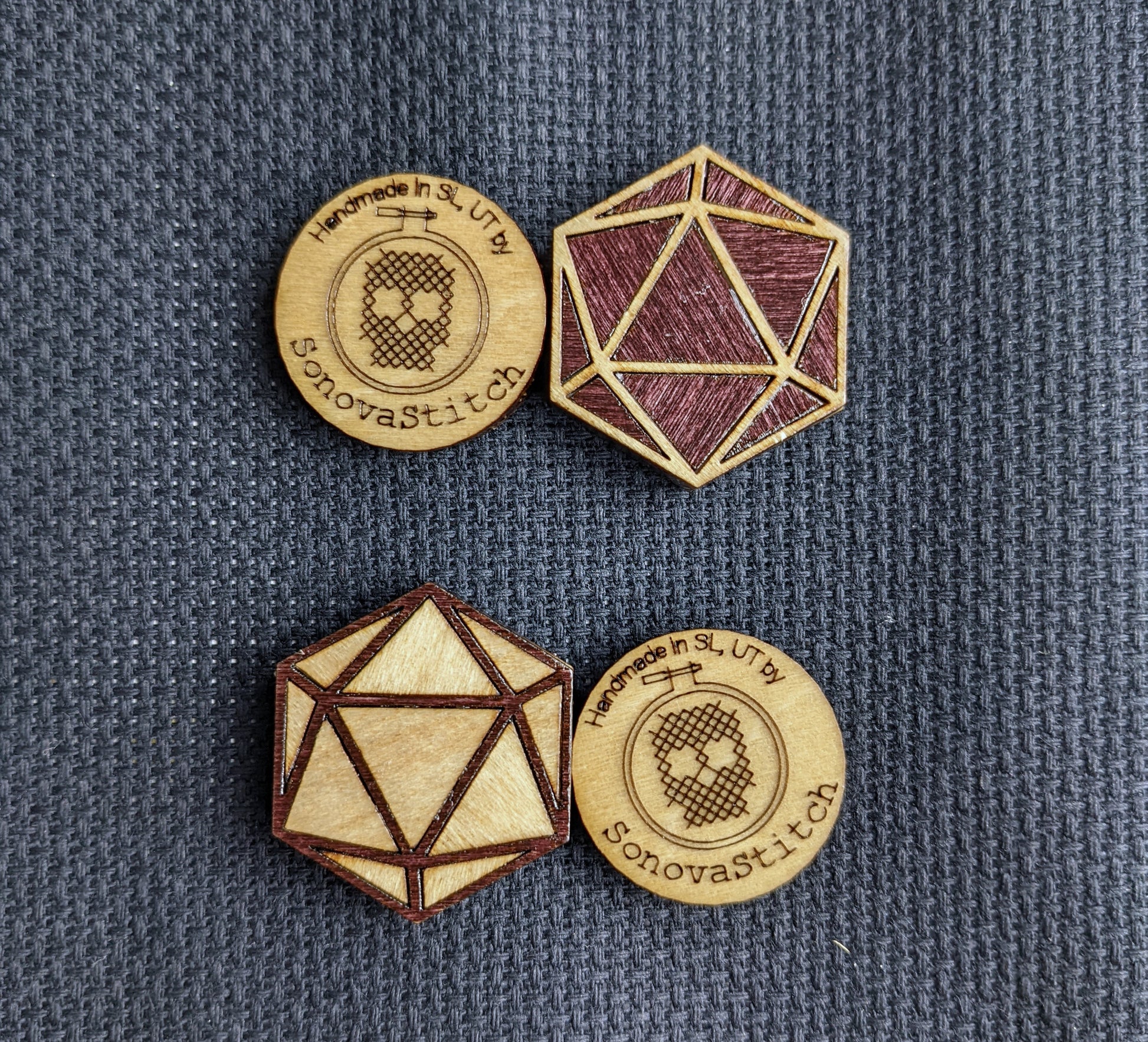 The design of these needleminders is of an abstraction of the overhead view of an icosahedron- the shape that makes a 20-sided die. The Icosahedron is also one of the platonic solids, and an extremely important shape in sacred geometry.