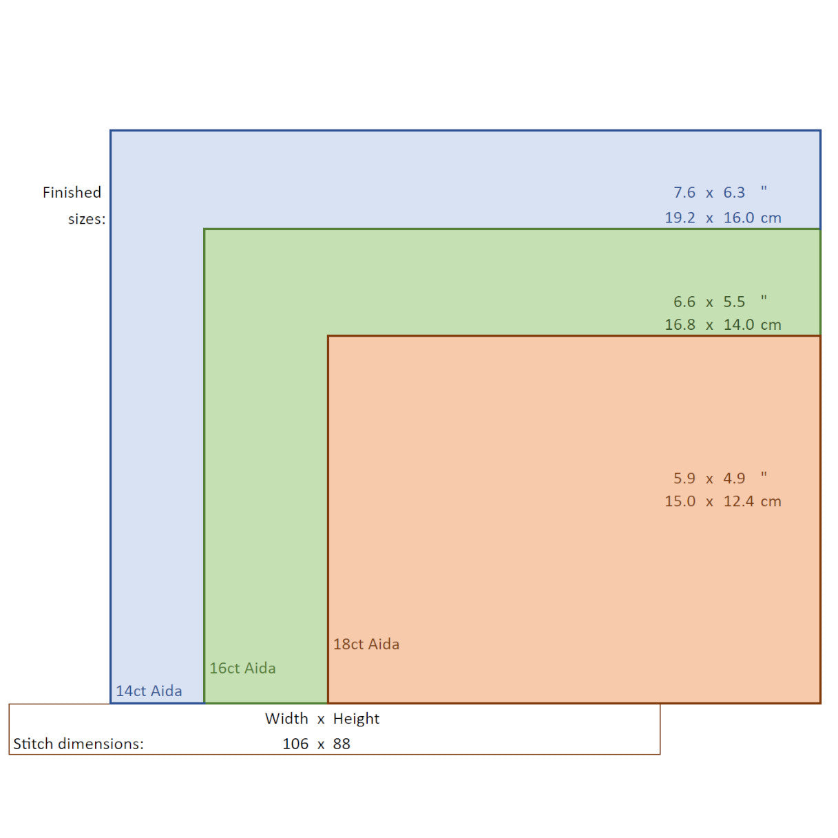 Size: 106x88 stitches (see images for sizing on different fabric counts)