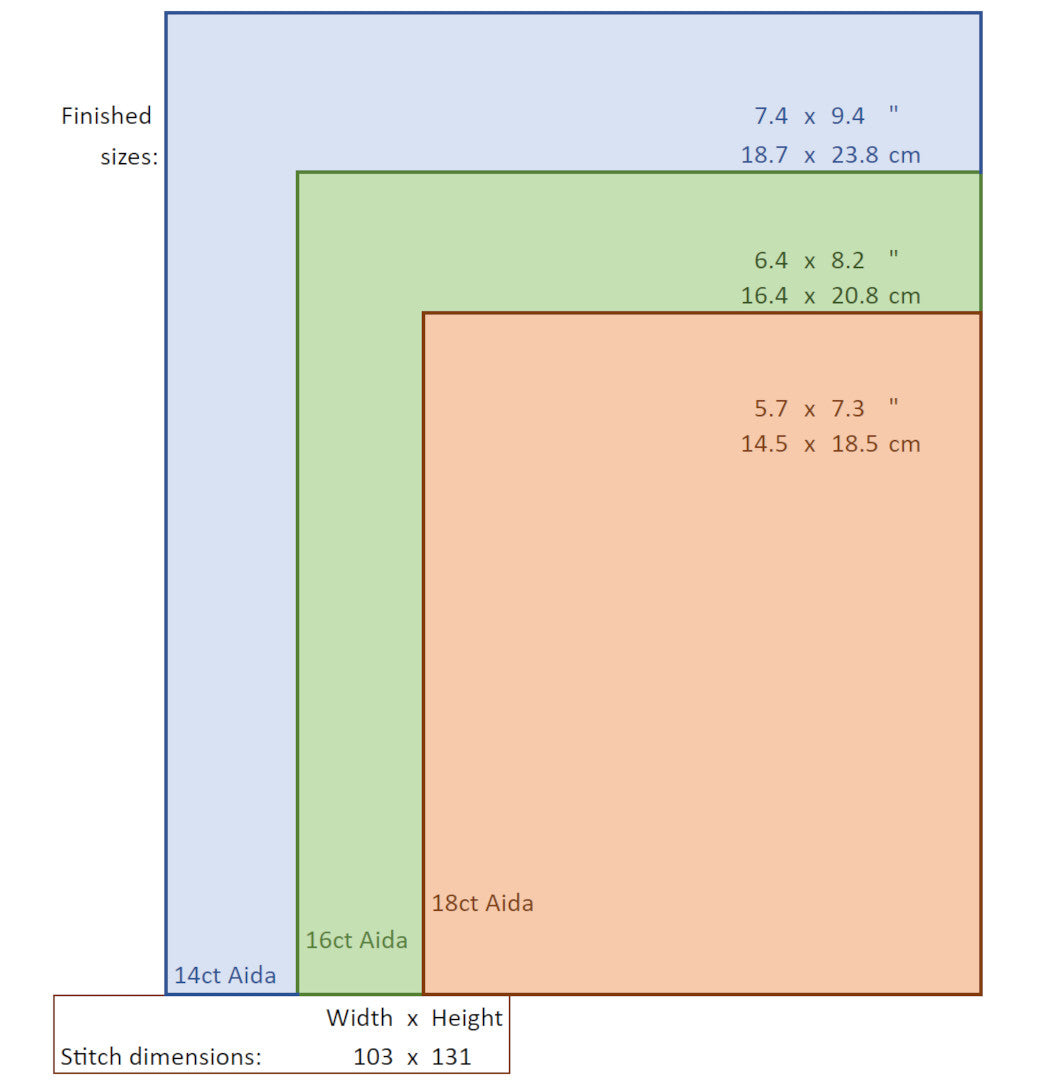 Size: 103x131 stitches (see images for sizing on different fabric counts)