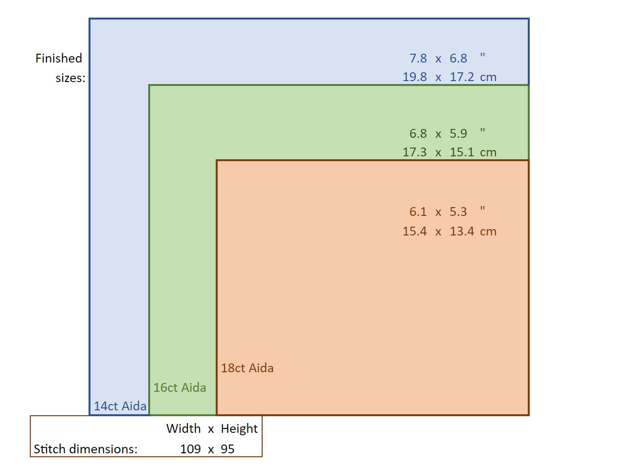 Size: 109x95 stitches (see images for sizing on different fabric counts)