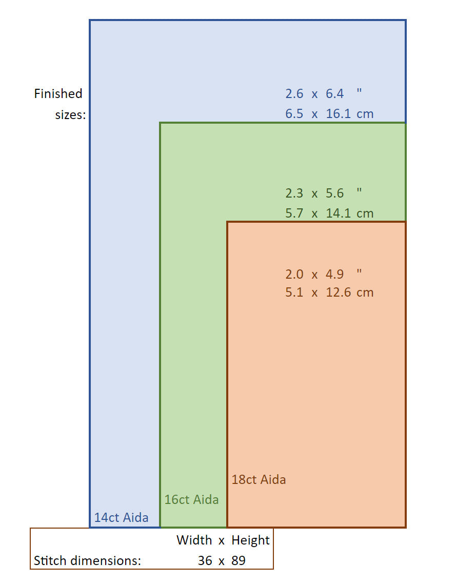 Size: 36 x 89 stitches (see images for sizing on different fabric counts)