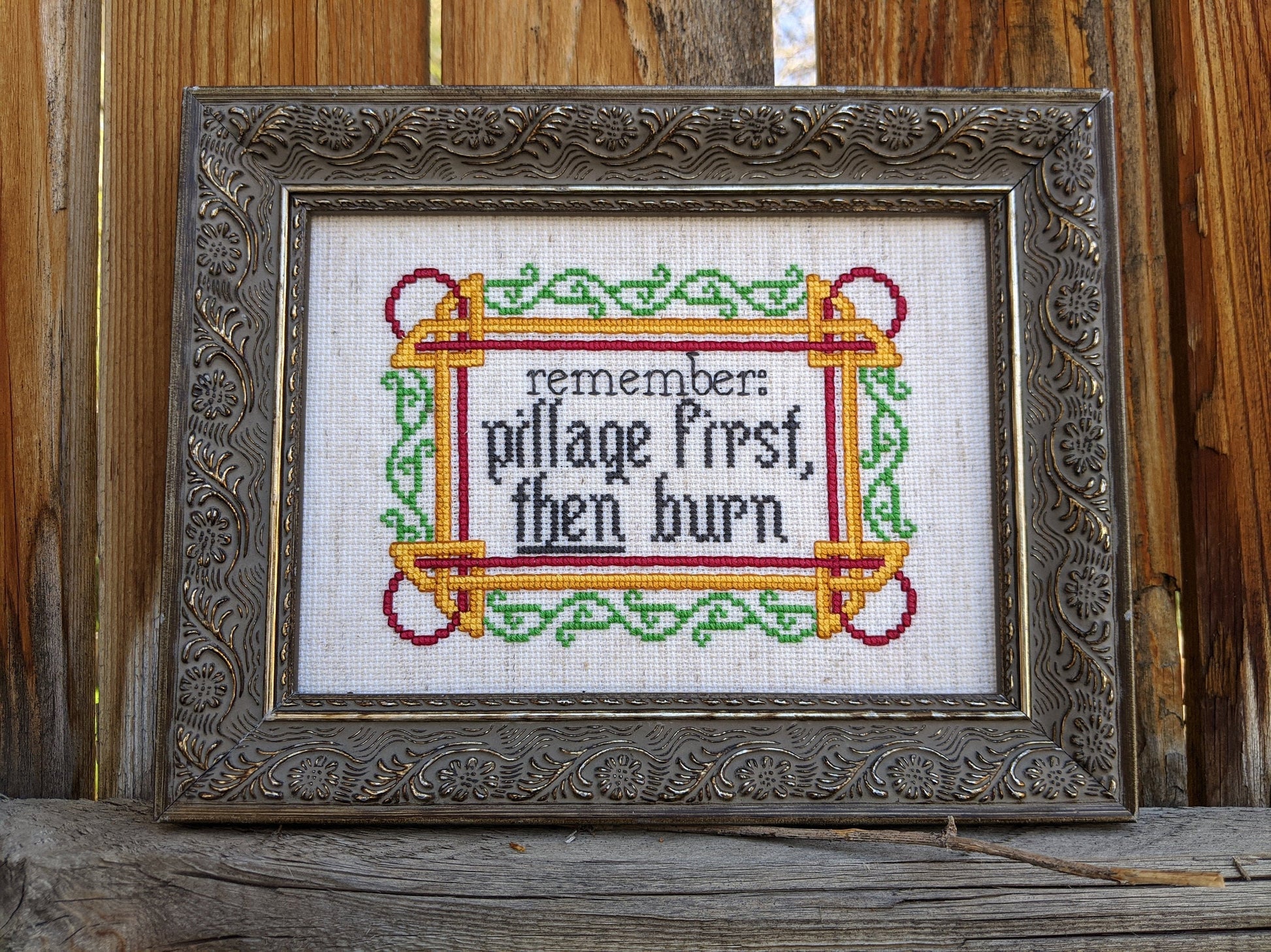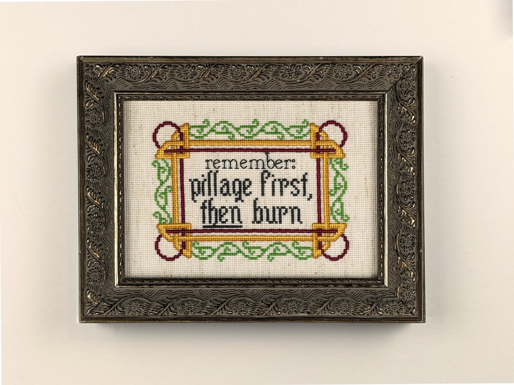 Raider's Creed: "Pillage First, Then Burn" funny subversive cross stitch pattern with Norse/Viking motifs - Instant PDF Download