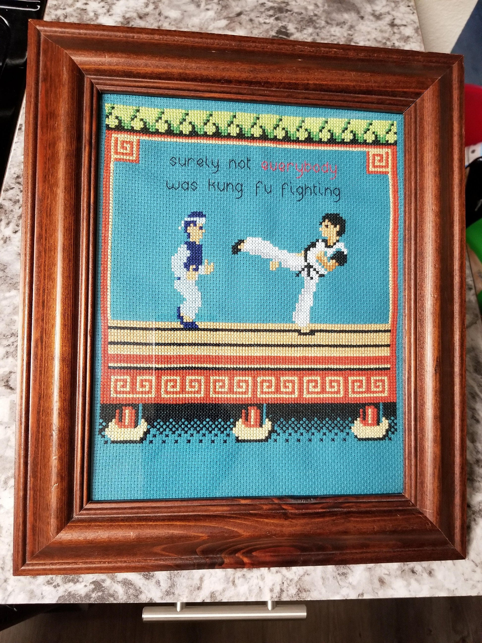 If you've had it with the rampant hyperbole in popular music from the 70's, this pattern will help you make a cross stitch to express your displeasure. I mean, obviously there would have had to be some conscientious objectors to this massive martial-arts brawl, right? There were probably even a few people who were doing Karate or Aikido instead, right? So let's try to make our disco songs a little more accurate and take fewer liberties with the facts from now on, hmmm? This stitch is inspired by the classic 8-bit Nintendo Entertainment System (NES) game, Kung Fu (itself a port of the arcade game Kung Fu Master) from 1985.