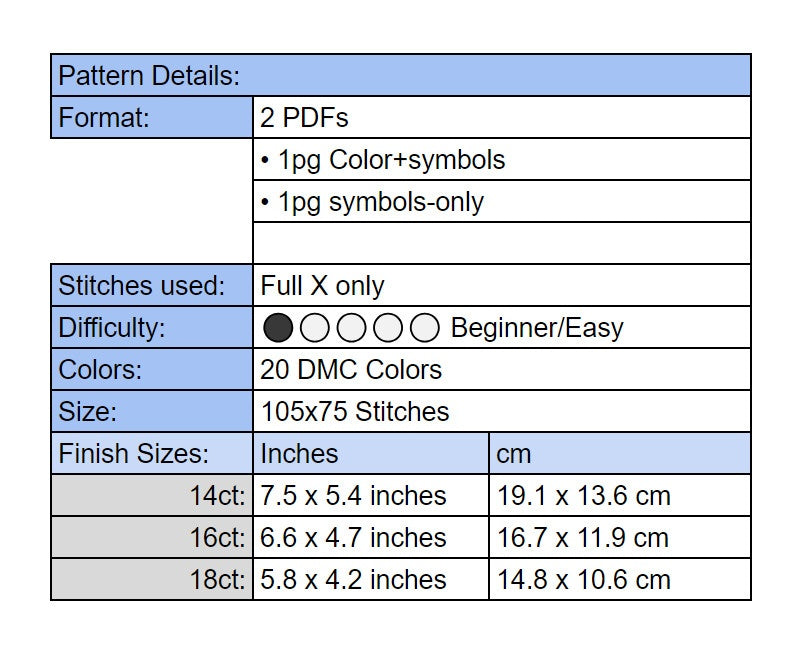 My mockup is shown to scale on 18ct aida in a 5x7 picture frame.